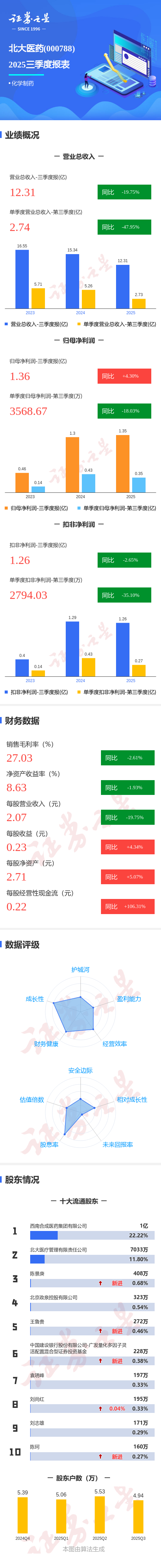 证券之星消息,北大医药2025年三季报显示,前三季度公司主营收入12.31亿元,同比下降19.76%;归母净利润1.36亿元,同比上升4.31%;扣非净利润1.26亿元,同比下降2.66%;其中2025年第三季度,公司单季度主营收入2.74亿元,同比下降47.95%;单季度归母净利润3568.67万元,同比下降18.04%;单季度扣非净利润2794.03万元,同比下降35.11%;负债率23.09%,投资收益247.19万元,财务费用-189.13万元,毛利率27.03%。