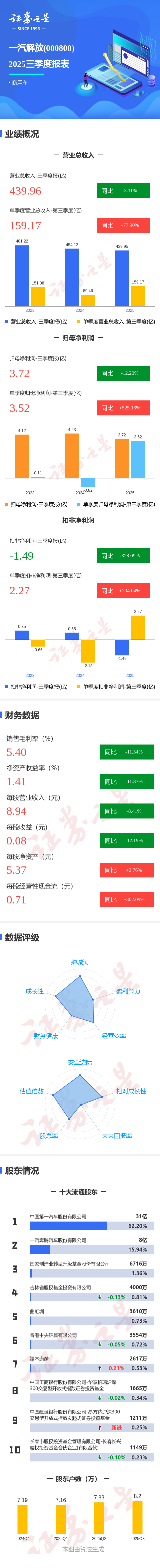 证券之星消息,一汽解放2025年三季报显示,前三季度公司主营收入439.96亿元,同比下降3.12%;归母净利润3.72亿元,同比下降12.21%;扣非净利润-1.49亿元,同比下降328.1%;其中2025年第三季度,公司单季度主营收入159.17亿元,同比上升77.91%;单季度归母净利润3.52亿元,同比上升525.14%;单季度扣非净利润2.27亿元,同比上升204.05%;负债率64.91%,投资收益-2196.56万元,财务费用-4.55亿元,毛利率5.4%。