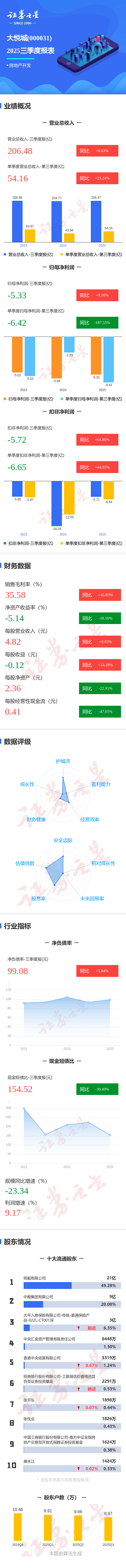 证券之星消息,大悦城2025年三季报显示,前三季度公司主营收入206.48亿元,同比上升0.83%;归母净利润-5.33亿元,同比上升9.17%;扣非净利润-5.72亿元,同比上升64.8%;其中2025年第三季度,公司单季度主营收入54.16亿元,同比上升23.24%;单季度归母净利润-6.42亿元,同比下降187.55%;单季度扣非净利润-6.65亿元,同比上升44.85%;负债率75.39%,投资收益-5.23亿元,财务费用14.46亿元,毛利率35.58%。