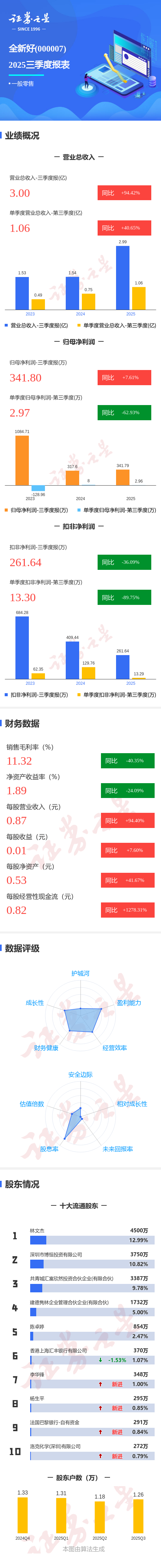 证券之星消息,全新好2025年三季报显示,前三季度公司主营收入3.0亿元,同比上升94.42%;归母净利润341.8万元,同比上升7.62%;扣非净利润261.64万元,同比下降36.1%;其中2025年第三季度,公司单季度主营收入1.06亿元,同比上升40.65%;单季度归母净利润2.97万元,同比下降62.94%;单季度扣非净利润13.3万元,同比下降89.75%;负债率46.81%,投资收益11.39万元,财务费用118.27万元,毛利率11.32%。