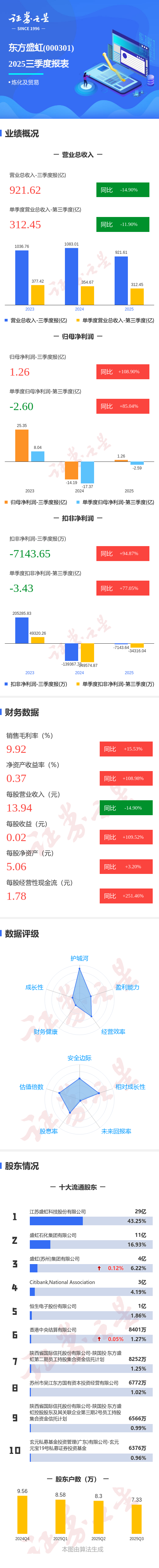 证券之星消息,东方盛虹2025年三季报显示,前三季度公司主营收入921.62亿元,同比下降14.9%;归母净利润1.26亿元,同比上升108.91%;扣非净利润-7143.65万元,同比上升94.87%;其中2025年第三季度,公司单季度主营收入312.45亿元,同比下降11.91%;单季度归母净利润-2.6亿元,同比上升85.05%;单季度扣非净利润-3.43亿元,同比上升77.06%;负债率82.26%,投资收益2.0亿元,财务费用34.37亿元,毛利率9.92%。