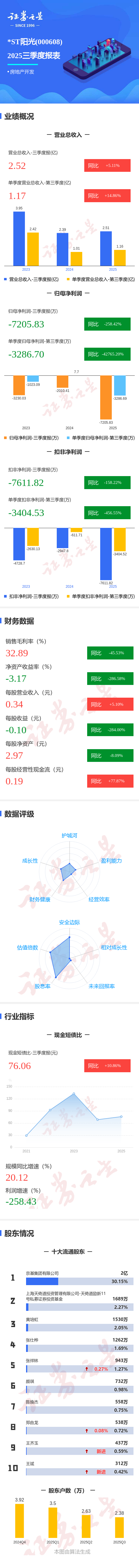 证券之星消息,*ST阳光2025年三季报显示,前三季度公司主营收入2.52亿元,同比上升5.11%;归母净利润-7205.83万元,同比下降258.43%;扣非净利润-7611.82万元,同比下降158.22%;其中2025年第三季度,公司单季度主营收入1.17亿元,同比上升14.86%;单季度归母净利润-3286.7万元,同比下降42765.2%;单季度扣非净利润-3404.53万元,同比下降456.56%;负债率42.09%,投资收益-837.6万元,财务费用6403.33万元,毛利率32.89%。