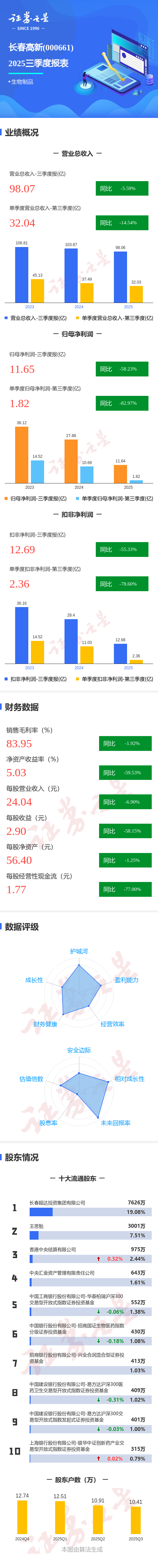 证券之星消息,长春高新2025年三季报显示,前三季度公司主营收入98.07亿元,同比下降5.6%;归母净利润11.65亿元,同比下降58.23%;扣非净利润12.69亿元,同比下降55.33%;其中2025年第三季度,公司单季度主营收入32.04亿元,同比下降14.55%;单季度归母净利润1.82亿元,同比下降82.98%;单季度扣非净利润2.36亿元,同比下降78.61%;负债率17.55%,投资收益-7948.19万元,财务费用-494.98万元,毛利率83.95%。