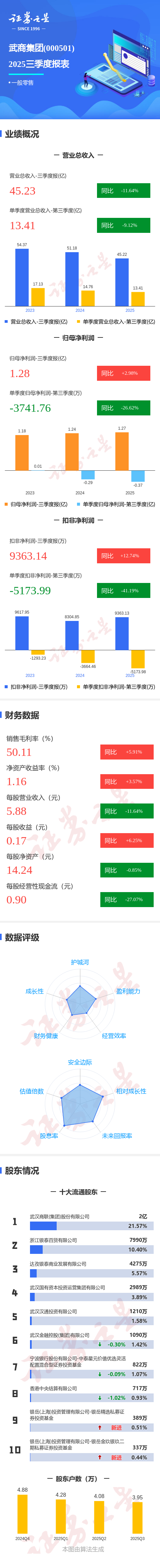 证券之星消息,武商集团2025年三季报显示,前三季度公司主营收入45.23亿元,同比下降11.64%;归母净利润1.28亿元,同比上升2.98%;扣非净利润9363.14万元,同比上升12.74%;其中2025年第三季度,公司单季度主营收入13.41亿元,同比下降9.13%;单季度归母净利润-3741.76万元,同比下降26.63%;单季度扣非净利润-5173.99万元,同比下降41.19%;负债率64.71%,投资收益1756.77万元,财务费用1.66亿元,毛利率50.11%。