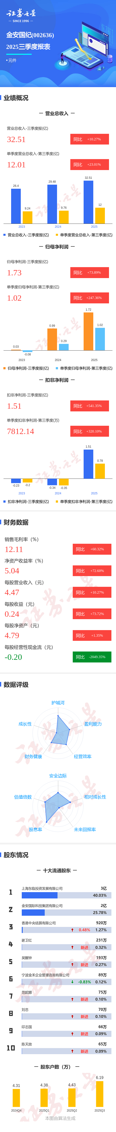 证券之星消息,金安国纪2025年三季报显示,前三季度公司主营收入32.51亿元,同比上升10.28%;归母净利润1.73亿元,同比上升73.9%;扣非净利润1.51亿元,同比上升541.35%;其中2025年第三季度,公司单季度主营收入12.01亿元,同比上升23.02%;单季度归母净利润1.02亿元,同比上升247.36%;单季度扣非净利润7812.14万元,同比上升320.1%;负债率44.11%,投资收益-5871.77万元,财务费用-4141.87万元,毛利率12.11%。