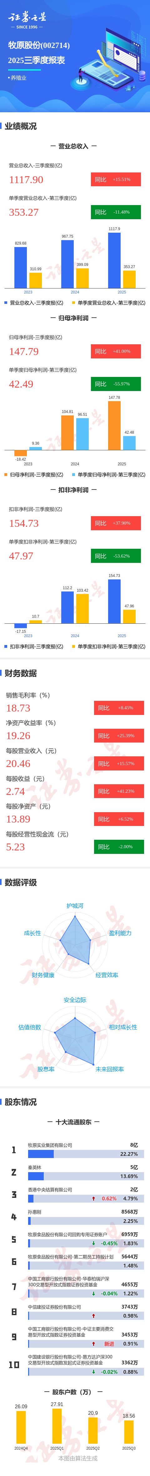 证券之星消息,牧原股份2025年三季报显示,前三季度公司主营收入1117.9亿元,同比上升15.52%;归母净利润147.79亿元,同比上升41.01%;扣非净利润154.73亿元,同比上升37.9%;其中2025年第三季度,公司单季度主营收入353.27亿元,同比下降11.48%;单季度归母净利润42.49亿元,同比下降55.98%;单季度扣非净利润47.97亿元,同比下降53.62%;负债率55.5%,投资收益9579.03万元,财务费用19.51亿元,毛利率18.73%。