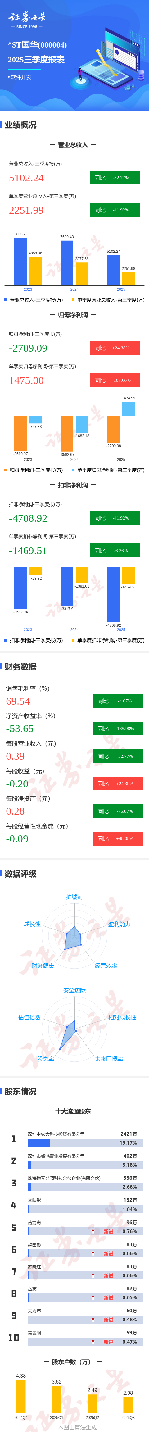 证券之星消息,*ST国华2025年三季报显示,前三季度公司主营收入5102.24万元,同比下降32.77%;归母净利润-2709.09万元,同比上升24.38%;扣非净利润-4708.92万元,同比下降41.92%;其中2025年第三季度,公司单季度主营收入2251.99万元,同比下降41.92%;单季度归母净利润1475.0万元,同比上升187.68%;单季度扣非净利润-1469.51万元,同比下降6.36%;负债率83.02%,投资收益6027.81万元,财务费用-0.16万元,毛利率69.54%。