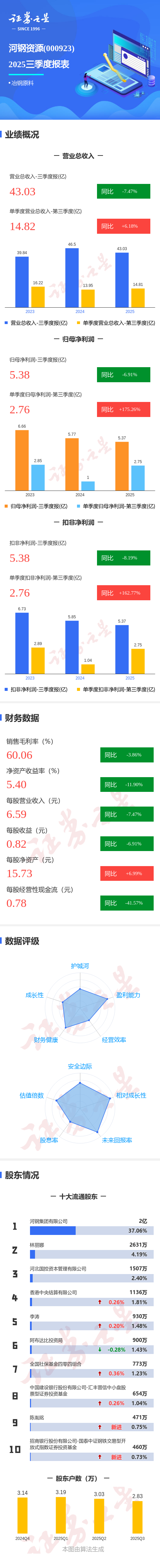 证券之星消息,河钢资源2025年三季报显示,前三季度公司主营收入43.03亿元,同比下降7.47%;归母净利润5.38亿元,同比下降6.91%;扣非净利润5.38亿元,同比下降8.2%;其中2025年第三季度,公司单季度主营收入14.82亿元,同比上升6.19%;单季度归母净利润2.76亿元,同比上升175.26%;单季度扣非净利润2.76亿元,同比上升162.78%;负债率24.43%,投资收益1876.31万元,财务费用-1.23亿元,毛利率60.06%。