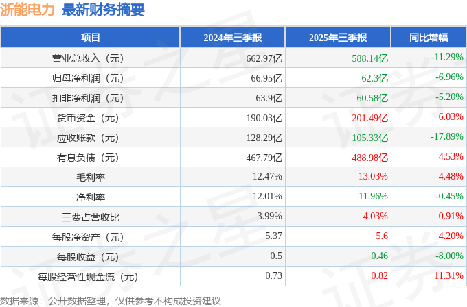 据证券之星公开数据整理,近期浙能电力(600023)发布2025年三季报。截至本报告期末,公司营业总收入588.14亿元,同比下降11.29%,归母净利润62.3亿元,同比下降6.96%。按单季度数据看,第三季度营业总收入233.42亿元,同比下降10.67%,第三季度归母净利润27.18亿元,同比下降1.83%。本报告期浙能电力公司应收账款体量较大,当期应收账款占最新年报归母净利润比达135.85%。
