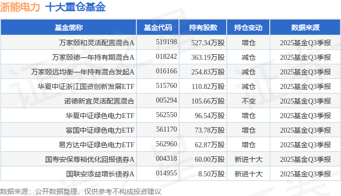 持有浙能电力最多的基金为万家颐和灵活配置混合A,目前规模为3.1亿元,最新净值1.6857(10月30日),较上一交易日下跌0.26%,近一年上涨6.53%。该基金现任基金经理为章恒。