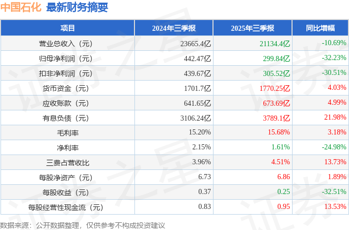 据证券之星公开数据整理,近期中国石化(600028)发布2025年三季报。截至本报告期末,公司营业总收入21134.41亿元,同比下降10.69%,归母净利润299.84亿元,同比下降32.23%。按单季度数据看,第三季度营业总收入7043.89亿元,同比下降10.88%,第三季度归母净利润85.01亿元,同比下降0.5%。本报告期中国石化公司应收账款体量较大,当期应收账款占最新年报归母净利润比达133.9%。