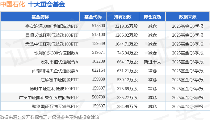 持有中国石化最多的基金为嘉实沪深300红利低波动ETF,目前规模为45.34亿元,最新净值1.3446(10月30日),较上一交易日上涨0.4%,近一年上涨4.57%。该基金现任基金经理为王紫菡。