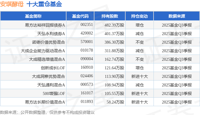 持有安琪酵母最多的基金为易方达裕祥回报债券A,目前规模为299.27亿元,最新净值1.621(10月29日),较上一交易日上涨0.25%,近一年上涨7.34%。该基金现任基金经理为王晓晨 王丹。