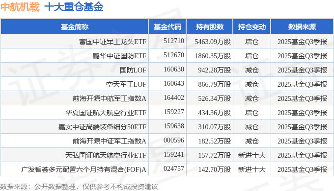 持有中航机载最多的基金为富国中证军工龙头ETF,目前规模为146.9亿元,最新净值0.6982(10月30日),较上一交易日下跌1.98%,近一年上涨8.35%。该基金现任基金经理为王乐乐 牛志冬。