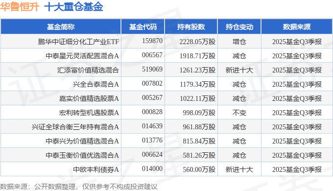 持有华鲁恒升最多的基金为鹏华中证细分化工产业ETF,目前规模为185.44亿元,最新净值0.7267(10月30日),较上一交易日下跌0.25%,近一年上涨23.54%。该基金现任基金经理为闫冬。