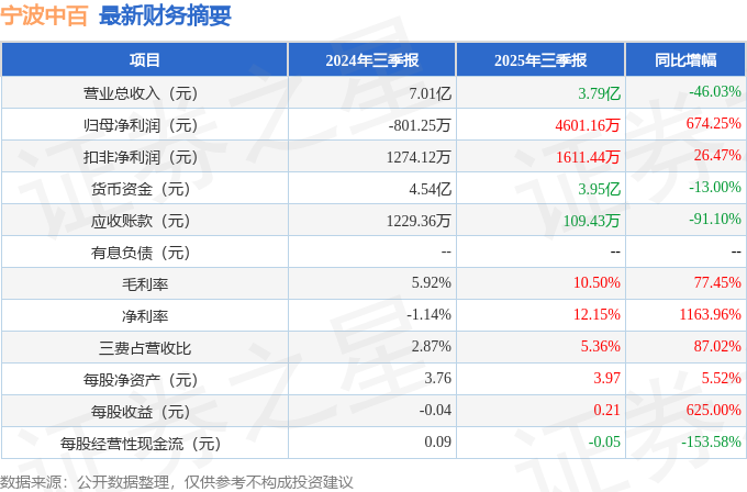 据证券之星公开数据整理,近期宁波中百(600857)发布2025年三季报。截至本报告期末,公司营业总收入3.79亿元,同比下降46.03%,归母净利润4601.16万元,同比上升674.25%。按单季度数据看,第三季度营业总收入8967.28万元,同比下降56.01%,第三季度归母净利润2837.6万元,同比上升164.65%。本报告期宁波中百盈利能力上升,毛利率同比增幅77.45%,净利率同比增幅1163.96%。