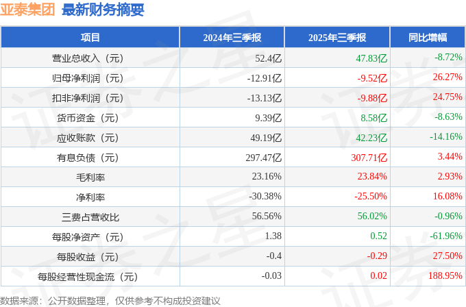 据证券之星公开数据整理,近期亚泰集团(600881)发布2025年三季报。截至本报告期末,公司营业总收入47.83亿元,同比下降8.72%,归母净利润-9.52亿元,同比上升26.27%。按单季度数据看,第三季度营业总收入17.46亿元,同比下降24.43%,第三季度归母净利润-1.29亿元,同比上升64.55%。本报告期亚泰集团短期债务压力上升,流动比率达0.57。