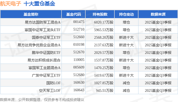 持有航天电子最多的基金为易方达国防军工混合A,目前规模为81.83亿元,最新净值1.566(10月29日),较上一交易日上涨0.58%,近一年上涨13.4%。该基金现任基金经理为何崇恺。