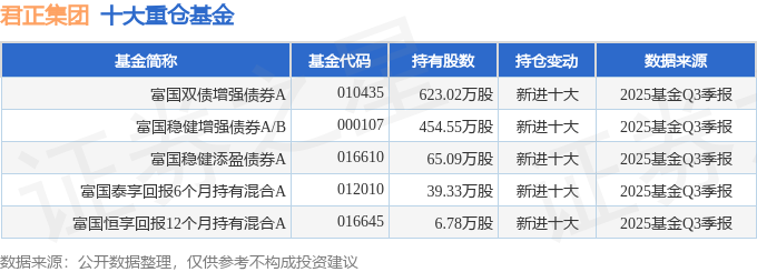 持有君正集团最多的基金为富国双债增强债券A,目前规模为27.8亿元,最新净值1.1473(10月30日),较上一交易日下跌0.23%,近一年上涨7.62%。该基金现任基金经理为俞晓斌。
