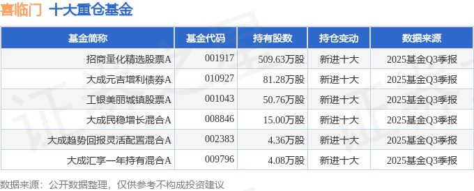 持有喜临门最多的基金为招商量化精选股票A,目前规模为36.63亿元,最新净值3.6375(10月29日),较上一交易日上涨0.68%,近一年上涨49.24%。该基金现任基金经理为王平。