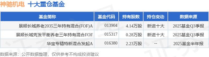 持有神驰机电最多的基金为景顺长城养老2035三年持有混合(FOF)A,目前规模为2.36亿元,最新净值1.0973(10月28日),较上一交易日下跌0.47%,近一年上涨18.77%。该基金现任基金经理为江虹。