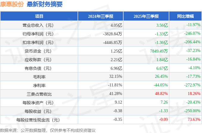 据证券之星公开数据整理,近期康惠股份(603139)发布2025年三季报。截至本报告期末,公司营业总收入3.56亿元,同比下降11.97%,归母净利润-1.33亿元,同比下降246.07%。按单季度数据看,第三季度营业总收入1.09亿元,同比下降21.8%,第三季度归母净利润-9230.03万元,同比下降211.97%。本报告期康惠股份短期债务压力上升,流动比率达0.79。