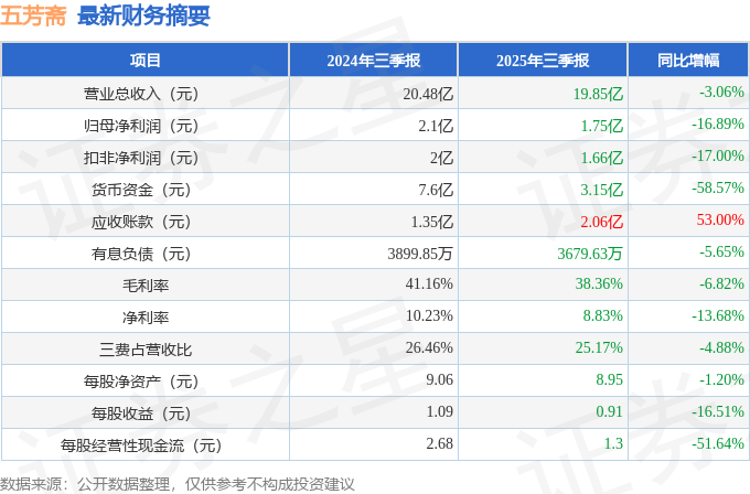据证券之星公开数据整理,近期五芳斋(603237)发布2025年三季报。截至本报告期末,公司营业总收入19.85亿元,同比下降3.06%,归母净利润1.75亿元,同比下降16.89%。按单季度数据看,第三季度营业总收入3.94亿元,同比下降15.68%,第三季度归母净利润-1961.96万元,同比上升15.01%。本报告期五芳斋应收账款上升,应收账款同比增幅达53%。