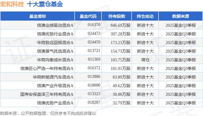 持有宏和科技最多的基金为信澳业绩驱动混合A,目前规模为7.13亿元,最新净值1.6783(10月30日),较上一交易日下跌4.24%,近一年上涨140.51%。该基金现任基金经理为刘小明。