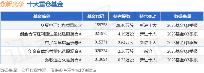 持有永新光学最多的基金为华夏中证红利质量ETF,目前规模为10.21亿元,最新净值1.0793(10月30日),较上一交易日下跌2.16%,近一年下跌1.1%。该基金现任基金经理为杨斯琪。