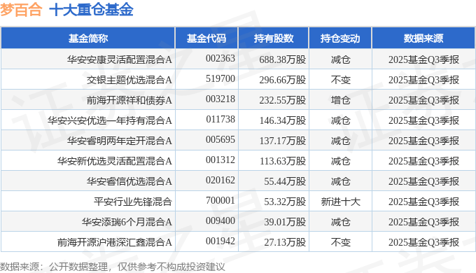 持有梦百合最多的基金为华安安康灵活配置混合A,目前规模为18.21亿元,最新净值1.8814(10月29日),较上一交易日上涨0.64%,近一年上涨6.17%。该基金现任基金经理为石雨欣 陆奔。