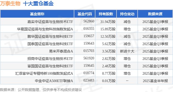 持有万泰生物最多的基金为嘉实中证疫苗与生物技术ETF,目前规模为2.45亿元,最新净值0.7258(10月30日),较上一交易日下跌1.35%,近一年上涨12.89%。该基金现任基金经理为王紫菡。