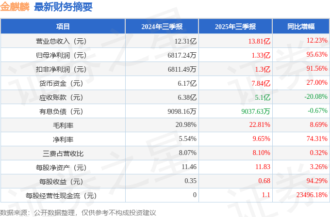 据证券之星公开数据整理,近期金麒麟(603586)发布2025年三季报。截至本报告期末,公司营业总收入13.81亿元,同比上升12.23%,归母净利润1.33亿元,同比上升95.63%。按单季度数据看,第三季度营业总收入4.17亿元,同比下降8.39%,第三季度归母净利润2566.92万元,同比下降26.97%。本报告期金麒麟盈利能力上升,毛利率同比增幅8.69%,净利率同比增幅74.31%。