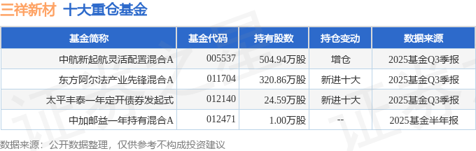 持有三祥新材最多的基金为中航新起航灵活配置混合A,目前规模为1.2亿元,最新净值0.9174(10月29日),较上一交易日上涨5.0%,近一年上涨81.05%。该基金现任基金经理为韩浩。