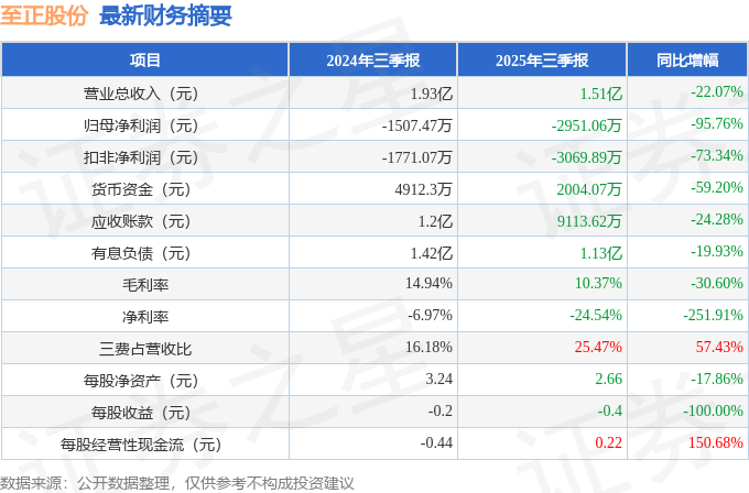 据证券之星公开数据整理,近期至正股份(603991)发布2025年三季报。截至本报告期末,公司营业总收入1.51亿元,同比下降22.07%,归母净利润-2951.06万元,同比下降95.76%。按单季度数据看,第三季度营业总收入4638.59万元,同比下降51.14%,第三季度归母净利润-686.26万元,同比上升22.79%。本报告期至正股份三费占比上升明显,财务费用、销售费用和管理费用总和占总营收同比增幅达57.43%。