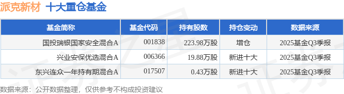 持有派克新材最多的基金为国投瑞银国家安全混合A,目前规模为28.57亿元,最新净值1.2189(10月29日),较上一交易日下跌0.01%,近一年上涨12.97%。该基金现任基金经理为李轩。