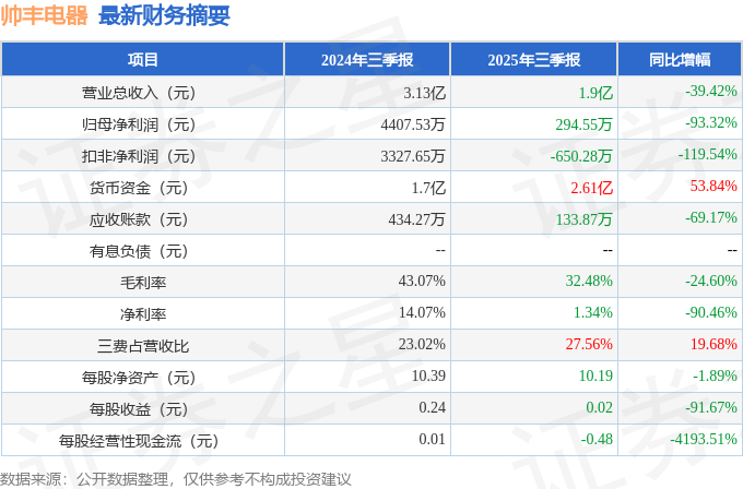 据证券之星公开数据整理,近期帅丰电器(605336)发布2025年三季报。根据财报显示,帅丰电器净利润同比下降93.32%。截至本报告期末,公司营业总收入1.9亿元,同比下降39.42%,归母净利润294.55万元,同比下降93.32%。按单季度数据看,第三季度营业总收入5939.25万元,同比下降25.57%,第三季度归母净利润-35.24万元,同比下降109.09%。