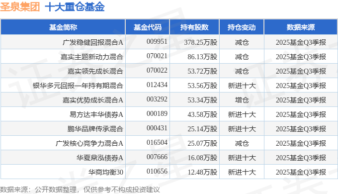 持有圣泉集团最多的基金为广发稳健回报混合A,目前规模为36.18亿元,最新净值0.9145(10月30日),较上一交易日下跌0.89%,近一年上涨13.57%。该基金现任基金经理为观富钦 王瑞冬。