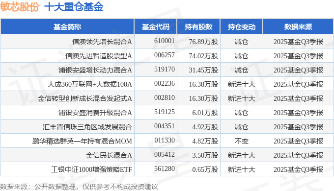 持有敏芯股份最多的基金为信澳领先增长混合A,目前规模为9.95亿元,最新净值1.7212(10月30日),较上一交易日下跌3.63%,近一年上涨57.78%。该基金现任基金经理为齐兴方。
