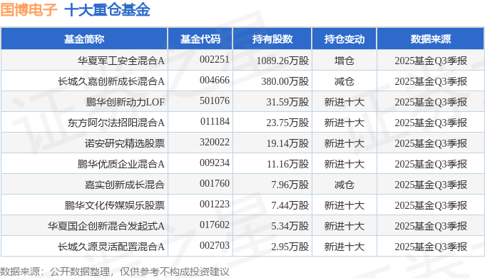 持有国博电子最多的基金为华夏军工安全混合A,目前规模为33.97亿元,最新净值1.868(10月30日),较上一交易日下跌0.16%,近一年上涨29.12%。该基金现任基金经理为万方方。