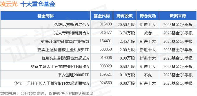 持有凌云光最多的基金为弘毅远方甄选混合A,目前规模为0.17亿元,最新净值1.3367(10月30日),较上一交易日下跌2.69%。该基金现任基金经理为马佳 王哲宇。