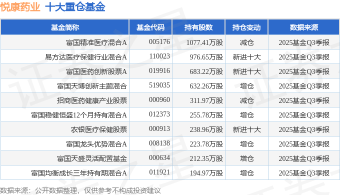 持有悦康药业最多的基金为富国精准医疗混合A,目前规模为34.91亿元,最新净值3.2204(10月29日),较上一交易日下跌1.82%,近一年上涨33.72%。该基金现任基金经理为赵伟。