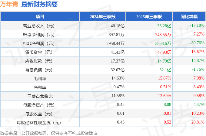 据证券之星公开数据整理,近期万年青(000789)发布2025年三季报。截至本报告期末,公司营业总收入33.28亿元,同比下降17.18%,归母净利润748.55万元,同比上升7.27%。按单季度数据看,第三季度营业总收入11.16亿元,同比下降21.93%,第三季度归母净利润-3328.53万元,同比下降708.62%。本报告期万年青盈利能力上升,毛利率同比增幅7.08%,净利率同比增幅8.4%。