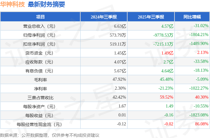 据证券之星公开数据整理,近期华神科技(000790)发布2025年三季报。截至本报告期末,公司营业总收入4.57亿元,同比下降31.02%,归母净利润-9778.53万元,同比下降1804.21%。按单季度数据看,第三季度营业总收入1.66亿元,同比下降19.26%,第三季度归母净利润-4294.13万元,同比下降1173.79%。本报告期华神科技三费占比上升明显,财务费用、销售费用和管理费用总和占总营收同比增幅达40.3%。