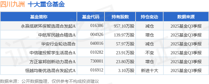 持有四川九洲最多的基金为永赢低碳环保智选混合发起A,目前规模为1.53亿元,最新净值0.8711(10月30日),较上一交易日下跌2.44%,近一年下跌5.12%。该基金现任基金经理为胡泽。