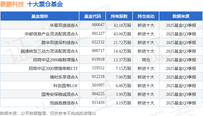 持有豪鹏科技最多的基金为华夏双债债券A,目前规模为19.09亿元,最新净值2.0807(10月30日),较上一交易日下跌0.84%,近一年上涨21.94%。该基金现任基金经理为柳万军。