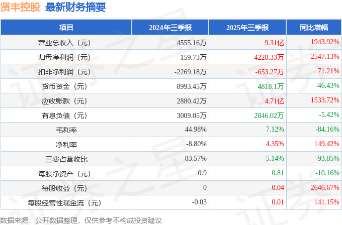 据证券之星公开数据整理,近期贤丰控股(002141)发布2025年三季报。截至本报告期末,公司营业总收入9.31亿元,同比上升1943.92%,归母净利润4228.33万元,同比上升2547.13%。按单季度数据看,第三季度营业总收入3.18亿元,同比上升1768.94%,第三季度归母净利润209.64万元,同比上升154.5%。本报告期贤丰控股公司应收账款体量较大,当期应收账款占最新年报营业总收入比达106.83%。