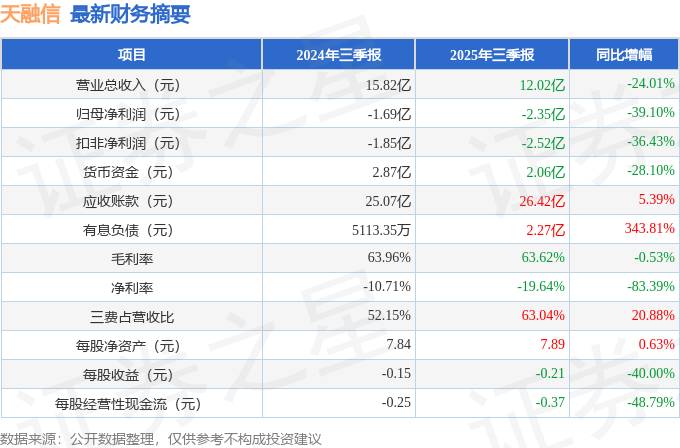 据证券之星公开数据整理,近期天融信(002212)发布2025年三季报。根据财报显示,天融信净利润同比下降39.1%,商誉占比较高。截至本报告期末,公司营业总收入12.02亿元,同比下降24.01%,归母净利润-2.35亿元,同比下降39.1%。按单季度数据看,第三季度营业总收入3.76亿元,同比下降46.96%,第三季度归母净利润-1.71亿元,同比下降568.0%。