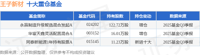 持有王子新材最多的基金为永赢制造升级智选混合发起A,目前规模为0.59亿元,最新净值1.1963(10月30日),较上一交易日下跌3.67%。该基金现任基金经理为胡泽。