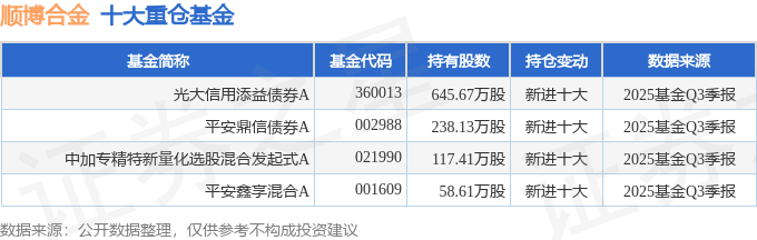 持有顺博合金最多的基金为光大信用添益债券A,目前规模为52.21亿元,最新净值1.253(10月30日),较上一交易日下跌0.95%,近一年上涨31.63%。该基金现任基金经理为黄波。