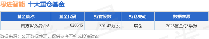 持有思进智能最多的基金为南方智弘混合A,目前规模为3.25亿元,最新净值1.5116(10月30日),较上一交易日下跌0.36%,近一年上涨36.81%。该基金现任基金经理为金岚枫。